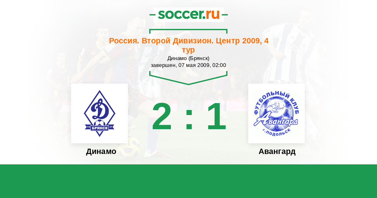 Россия. Вторая лига. Группа 3 31.08.2009 Авангард Логотип футбольный клуб Авангард (Подольск) 0:0 Логотип футбольный клуб Динамо Брянск Динамо Брянск