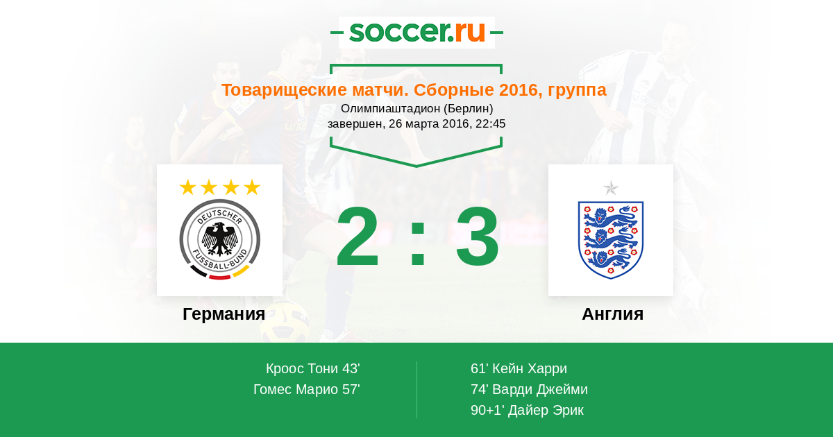 "...Германия - 1:0 Кроос Тони (18)Гооооооооол!!! Открывают счет гости. Ошибся Батленд когда выбивал мяч от ворот, а спустя пару секунд вратарь английской сборной зевнул дальний удар Крооса...." На Олимпиаштадион Немцы гости?!?!