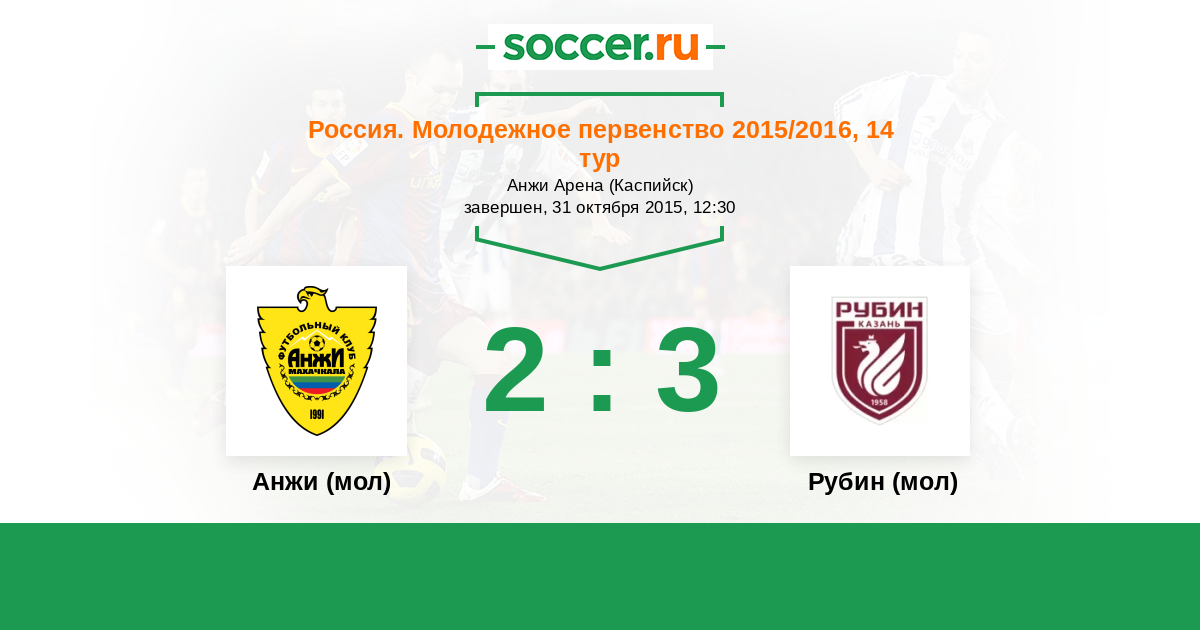 Россия. Премьер-Лига U21 05.10.2013 Рубин (мол) Логотип футбольный клуб Рубин (мол) (Казань) 1:1 Логотип футбольный клуб Анжи (мол) (Махачкала) Анжи (мол)