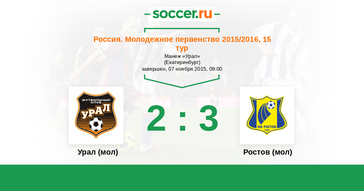 Россия. Премьер-Лига U21 04.04.2015 Урал (мол) Логотип футбольный клуб Урал (мол) (Екатеринбург) 0:2 Логотип футбольный клуб Ростов (мол) (Ростов-на-Дону) Ростов (мол)