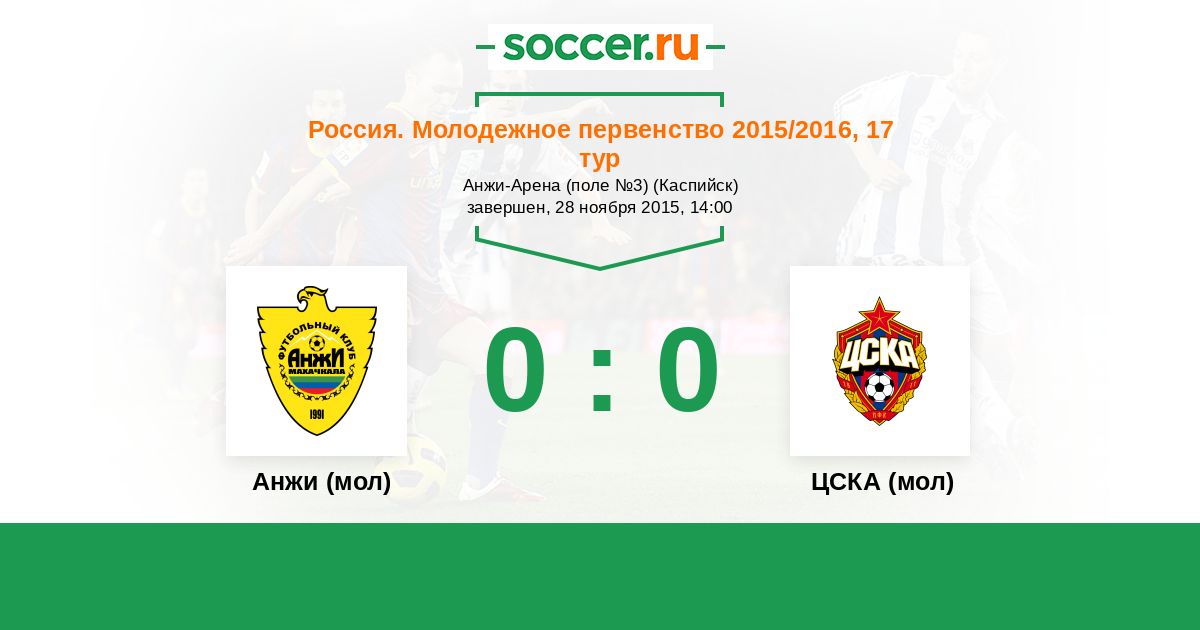 Россия. Премьер-Лига U21 31.07.2015 ЦСКА (мол) Логотип футбольный клуб ЦСКА (мол) (Москва) 0:0 Логотип футбольный клуб Анжи (мол) (Махачкала) Анжи (мол)