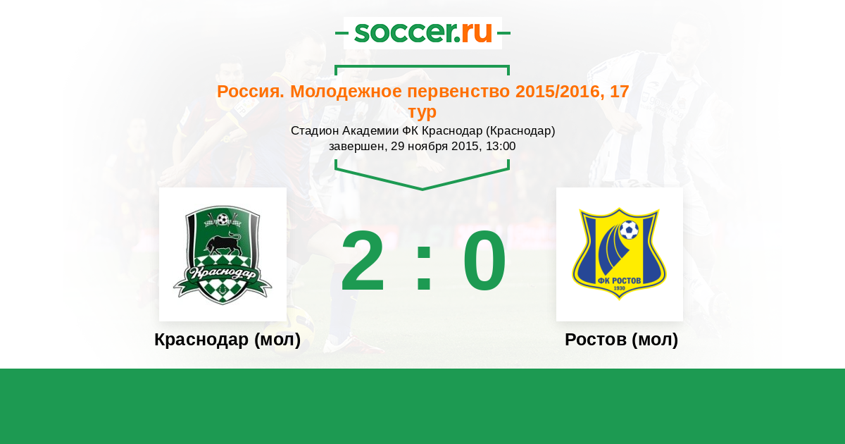 Россия. Премьер-Лига U21 01.08.2015 Ростов (мол) Логотип футбольный клуб Ростов (мол) (Ростов-на-Дону) 2:1 Логотип футбольный клуб Краснодар (мол) Краснодар (мол)
