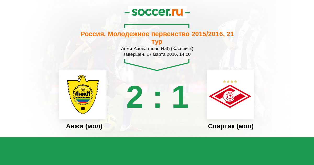 Россия. Премьер-Лига U21 27.08.2016 Анжи (мол) Логотип футбольный клуб Анжи (мол) (Махачкала) 2:1 Логотип футбольный клуб Спартак (мол) (Москва) Спартак (мол)