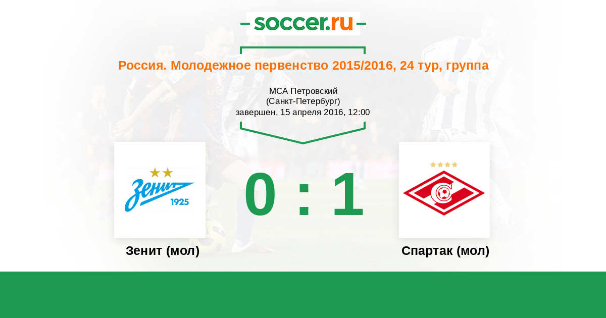 Россия. Премьер-Лига U21 01.05.2015 Спартак (мол) Логотип футбольный клуб Спартак (мол) (Москва) 2:3 Логотип футбольный клуб Зенит (мол) (Санкт-Петербург) Зенит (мол)