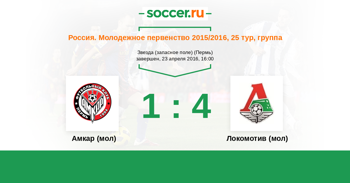 Россия. Премьер-Лига U21 03.05.2015 Амкар (мол) Логотип футбольный клуб Амкар (мол) (Пермь) 0:3 Логотип футбольный клуб Локомотив (мол) (Москва) Локомотив (мол)