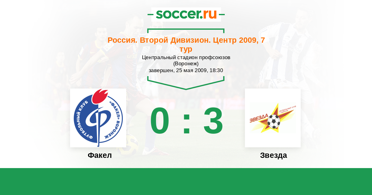 Россия. Вторая лига. Группа 3 24.08.2009 Звезда Логотип футбольный клуб Звезда (Серпухов) 3:0 Логотип футбольный клуб Факел (Воронеж) Факел