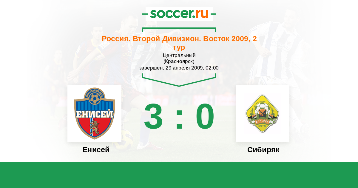 Россия. 2-й дивизион. Восток 02.09.2009 Енисей Логотип футбольный клуб Енисей (Красноярск) 0:0 Логотип футбольный клуб Сибиряк (Братск) Сибиряк