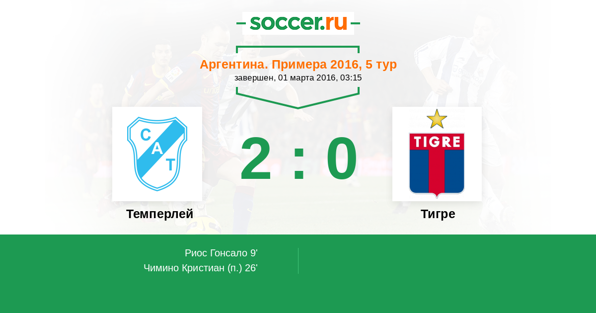 9' (1:0) Риос Гонсало (28) (Сапетти Леандро (37))