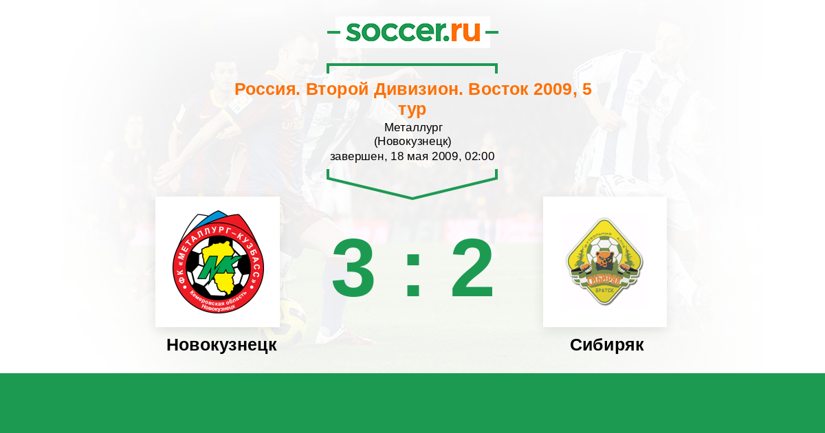 Россия. 2-й дивизион. Восток 05.07.2009 Сибиряк Логотип футбольный клуб Сибиряк (Братск) 2:1 Логотип футбольный клуб Металлург-Кузбасс (Новокузнецк) Металлург-Кузбасс