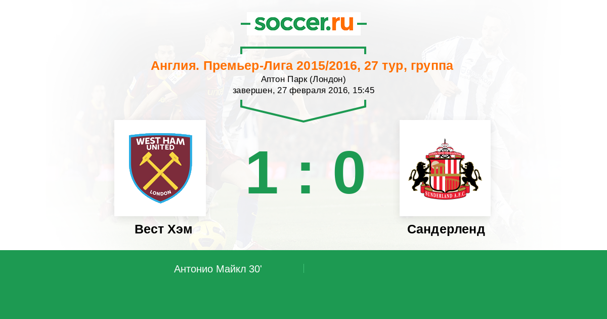 Протокол матча Вест Хэм против Сандерленд