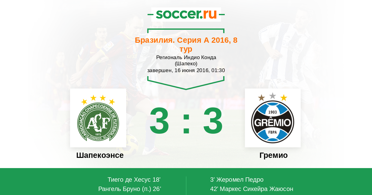 3' (0:1) Жеромел Педро (3) (дос Сантос Дуглас (10))