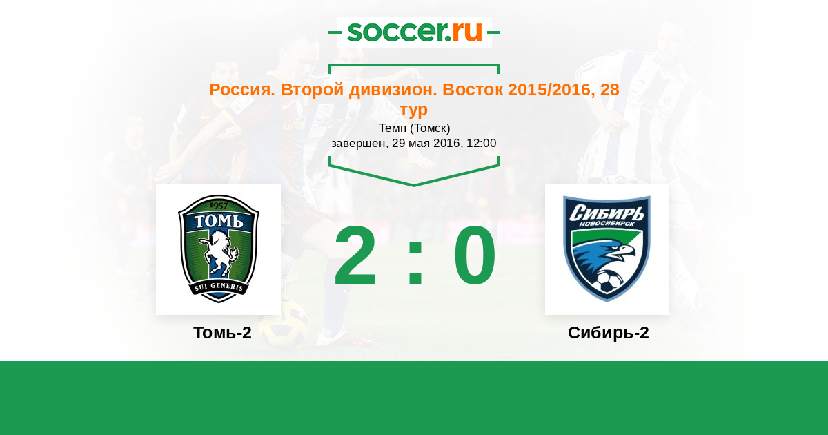 Россия. 2-й дивизион. Восток 29.05.2016 Томь-2 Логотип футбольный клуб Томь-2 (Томск) 2:0 Логотип футбольный клуб Сибирь-2 (Новосибирск) Сибирь-2