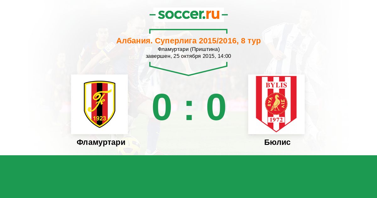 Албания. Суперлига 14.05.2016 Бюлис Логотип футбольный клуб Бюлис (Баллш) 0:0 Логотип футбольный клуб Фламуртари (Влера) Фламуртари