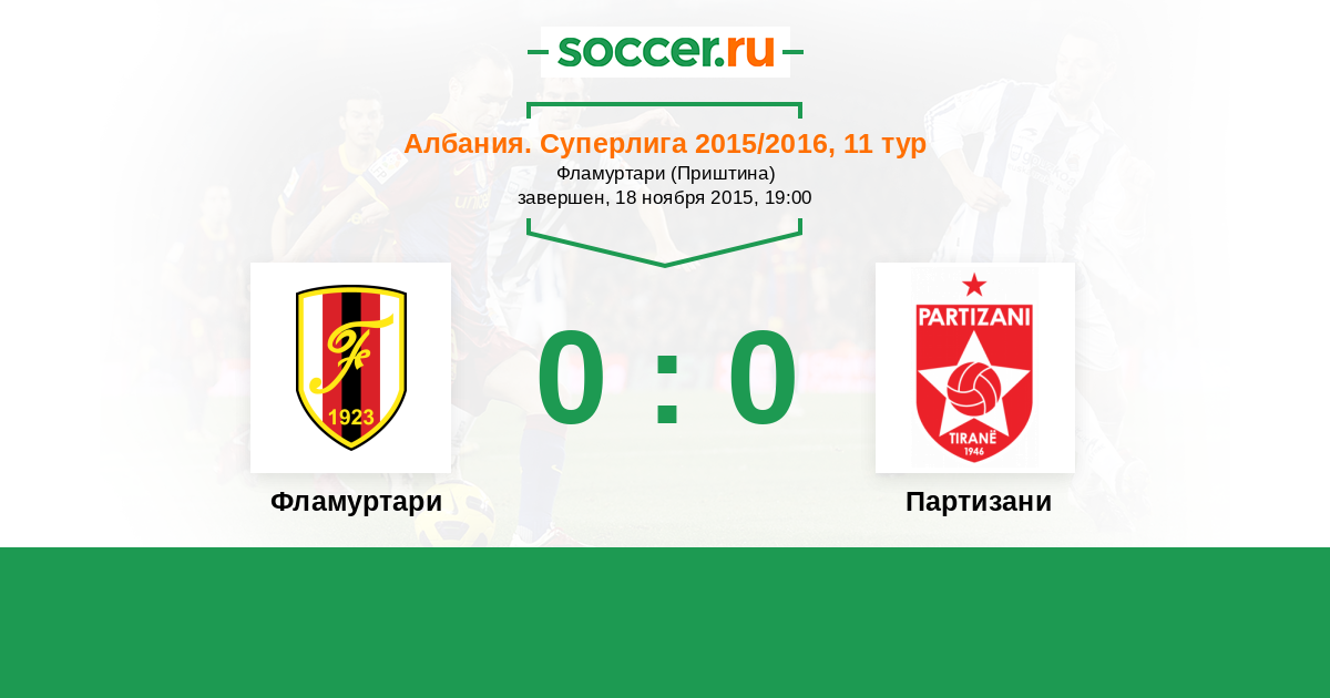 Албания. Суперлига 28.09.2013 Партизани Логотип футбольный клуб Партизани (Тирана) 0:0 Логотип футбольный клуб Фламуртари (Влера) Фламуртари