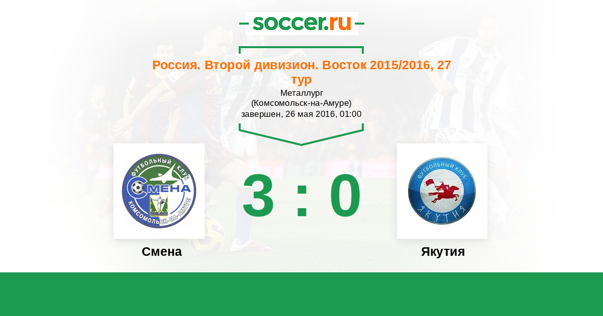 Россия. 2-й дивизион. Восток 26.05.2016 Смена Логотип футбольный клуб Смена (Комсомольск-на-Амуре) 3:0 Логотип футбольный клуб Якутия (Якутск) Якутия