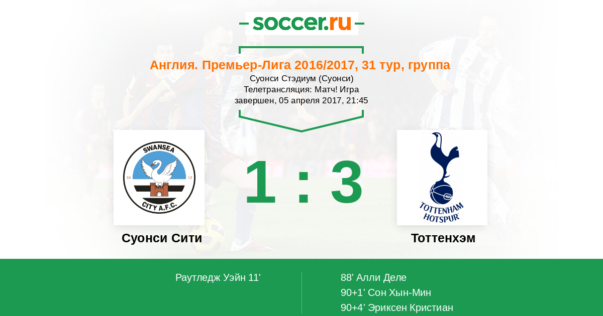 Гол90+4' (1:3) Эриксен Кристиан (23) (Алли Деле (20))