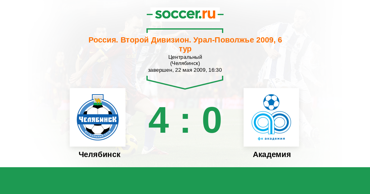 Россия. Вторая лига. Группа 4 30.08.2009 Академия Логотип футбольный клуб Академия (Тольятти) 0:4 Логотип футбольный клуб Челябинск Челябинск