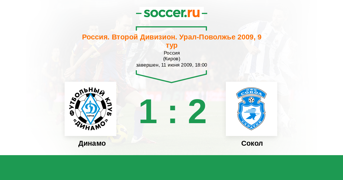 Россия. Вторая лига. Группа 4 19.09.2009 Сокол Логотип футбольный клуб Сокол (Саратов) 1:0 Логотип футбольный клуб Динамо Киров Динамо Киров