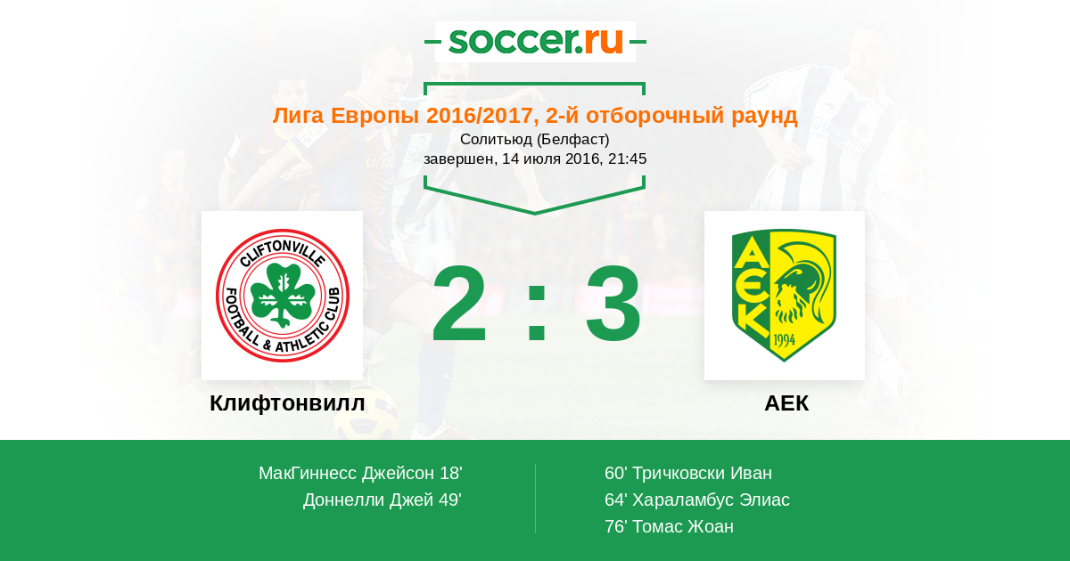 Протокол матча Клифтонвилл против АЕК