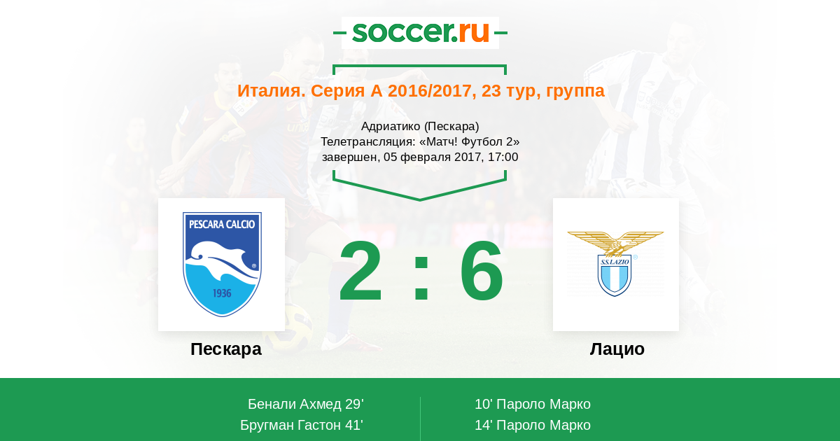 Пескара - Фиорентина 1:2 (победный гол в переигранное время).