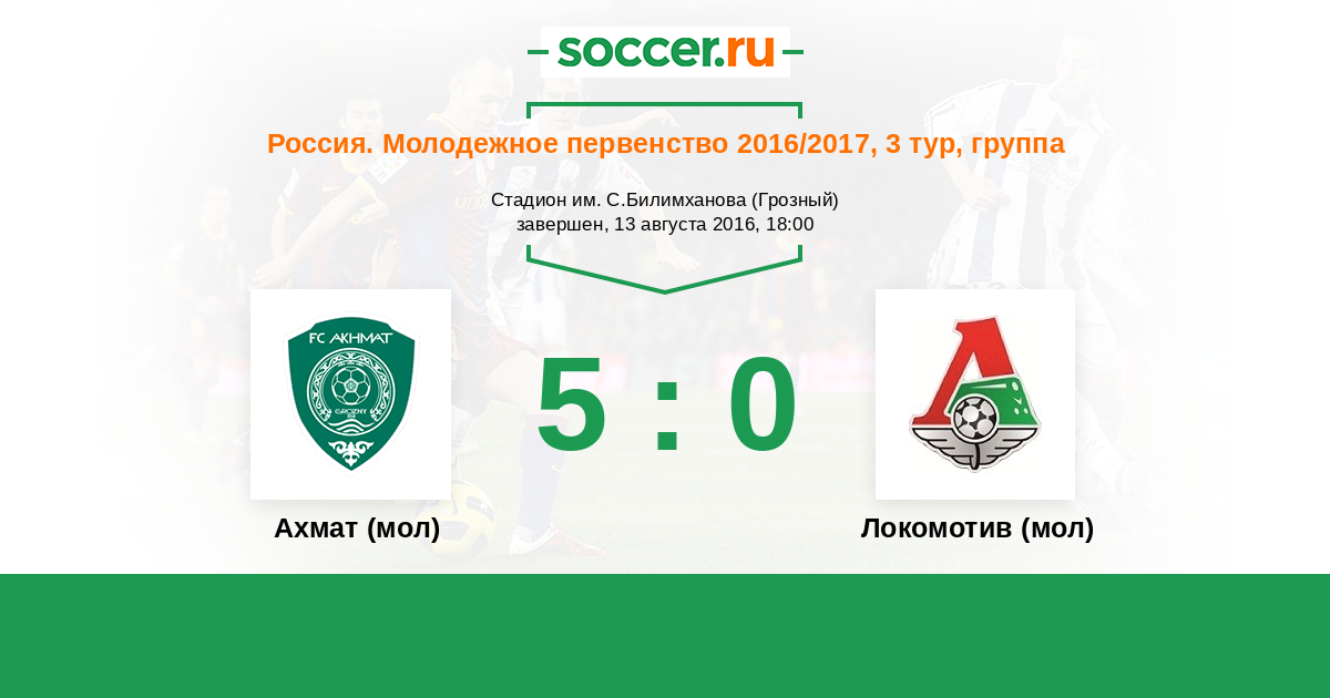 Россия. Премьер-Лига U21 09.09.2017 Ахмат (мол) Логотип футбольный клуб Ахмат (мол) (Грозный) 3:2 Логотип футбольный клуб Локомотив (мол) (Москва) Локомотив (мол)
