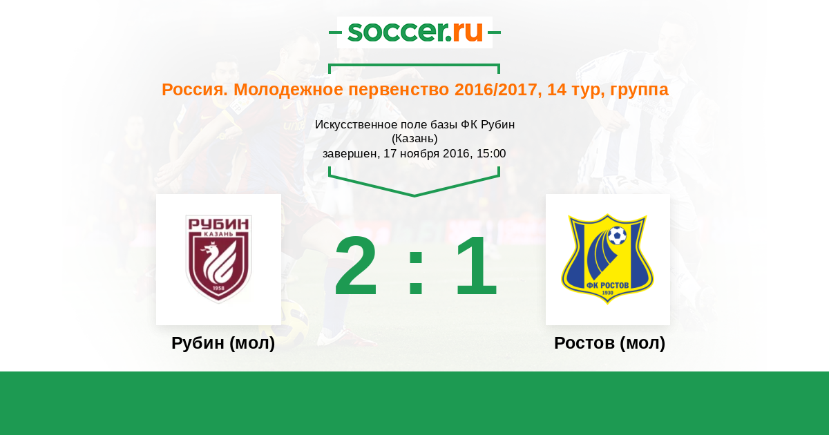 Россия. Премьер-Лига U21 29.03.2014 Рубин (мол) Логотип футбольный клуб Рубин (мол) (Казань) 3:0 Логотип футбольный клуб Ростов (мол) (Ростов-на-Дону) Ростов (мол)