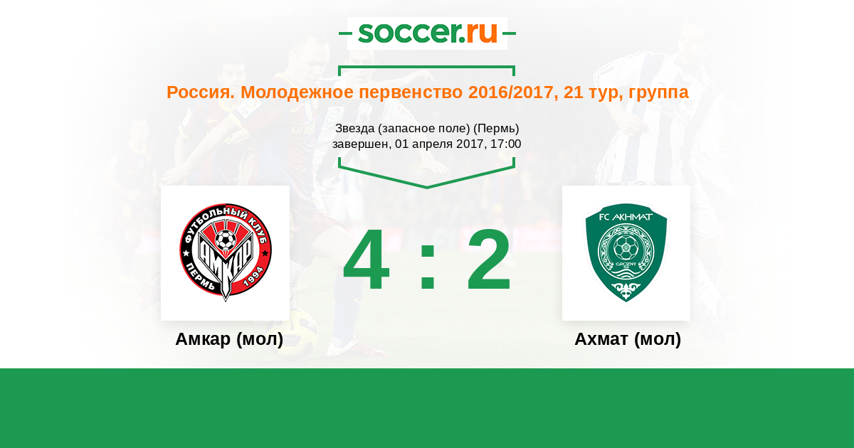 Россия. Премьер-Лига U21 15.07.2017 Ахмат (мол) Логотип футбольный клуб Ахмат (мол) (Грозный) 2:1 Логотип футбольный клуб Амкар (мол) (Пермь) Амкар (мол)