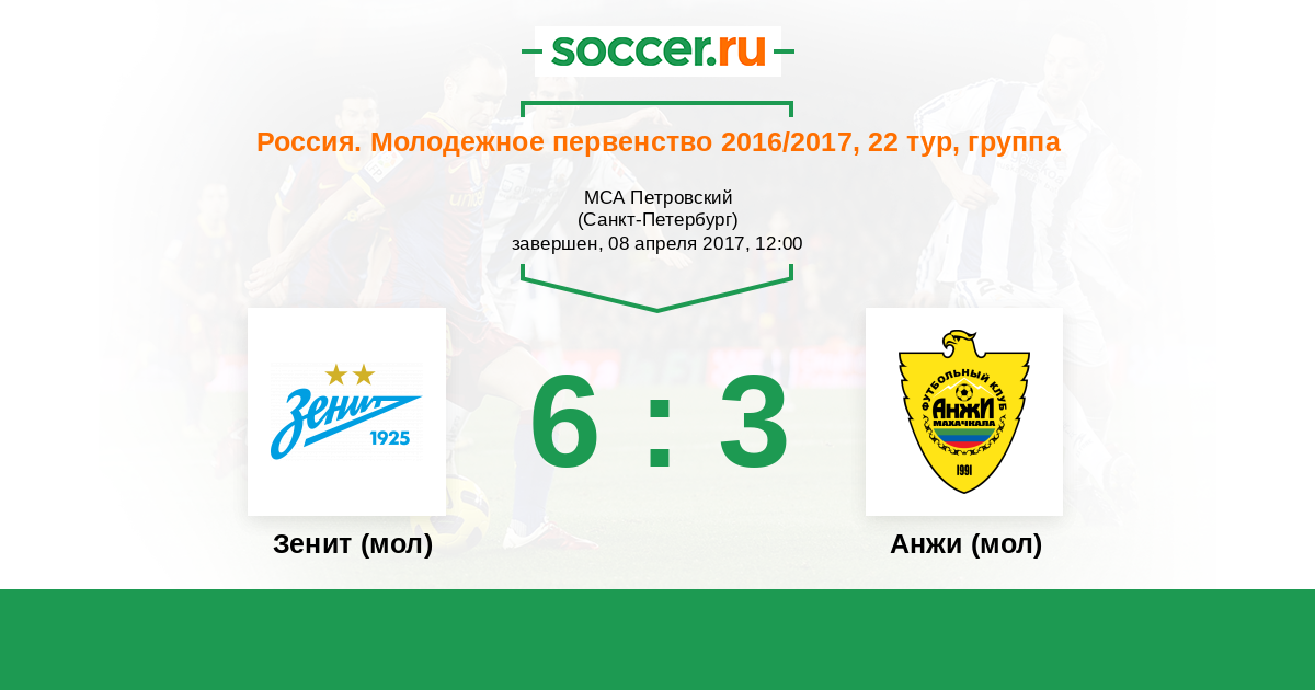 Россия. Премьер-Лига U21 06.05.2016 Анжи (мол) Логотип футбольный клуб Анжи (мол) (Махачкала) 2:1 Логотип футбольный клуб Зенит (мол) (Санкт-Петербург) Зенит (мол)