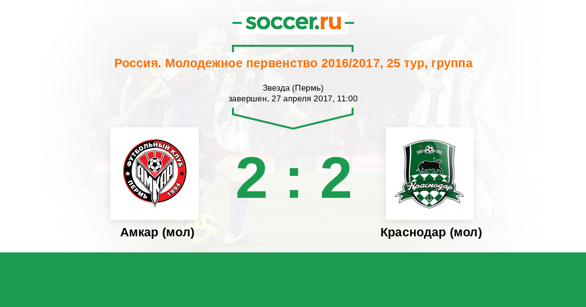 Россия. Премьер-Лига U21 01.05.2012 Амкар (мол) Логотип футбольный клуб Амкар (мол) (Пермь) 1:1 Логотип футбольный клуб Краснодар (мол) Краснодар (мол)