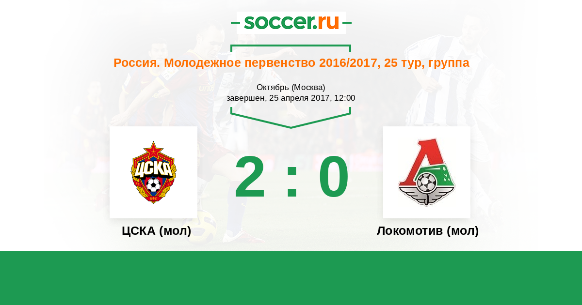 Россия. Премьер-Лига U21 25.09.2015 ЦСКА (мол) Логотип футбольный клуб ЦСКА (мол) (Москва) 3:0 Логотип футбольный клуб Локомотив (мол) (Москва) Локомотив (мол)