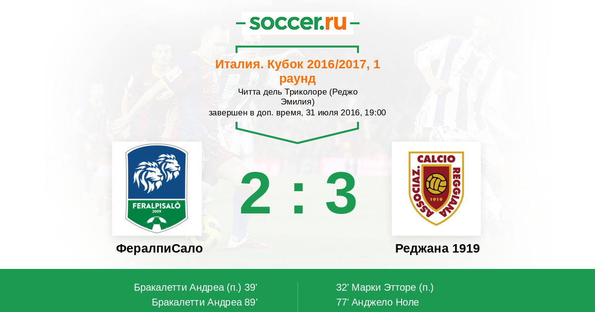 Протокол матча ФералпиСало против Реджана 1919
