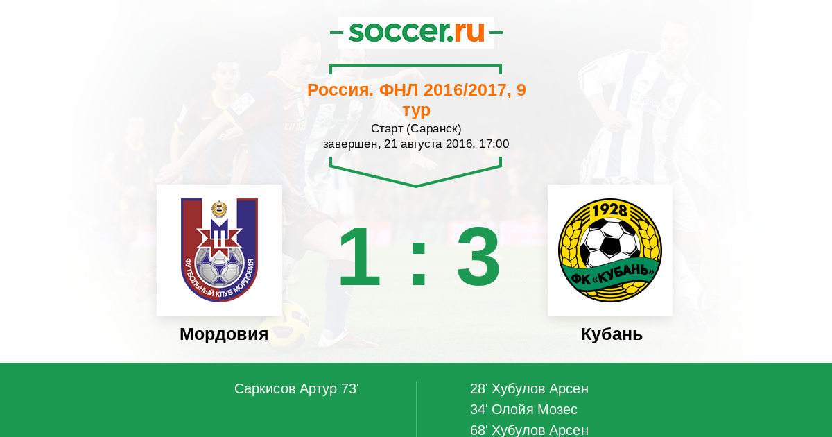 Протокол матча Мордовия против Кубань
