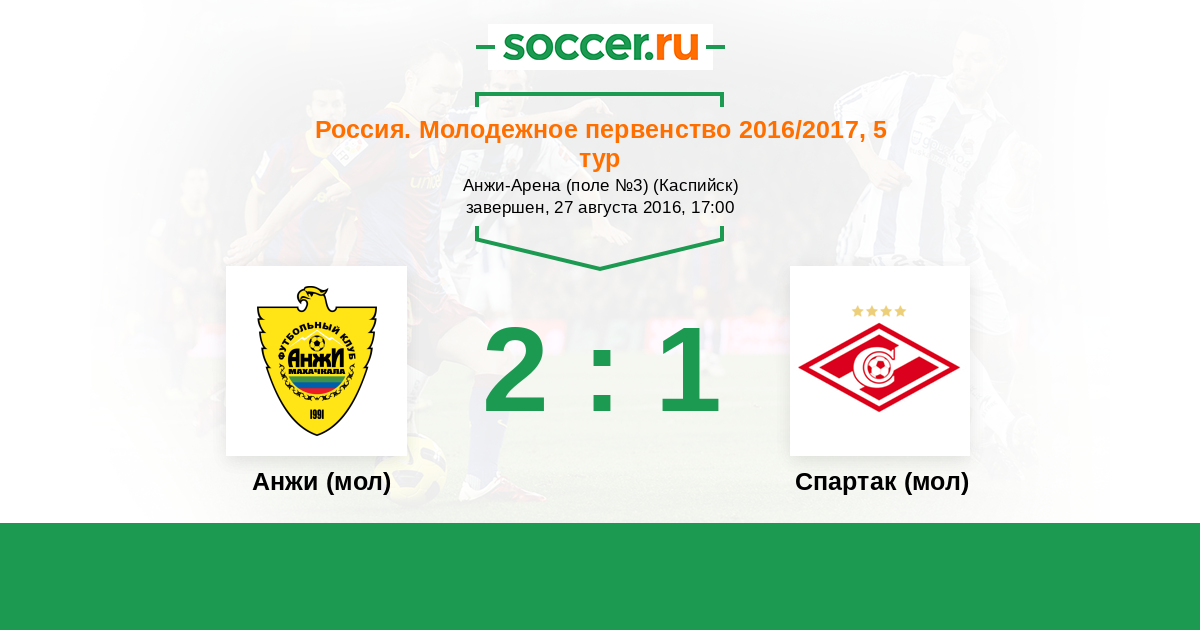 Россия. Премьер-Лига U21 28.08.2015 Спартак (мол) Логотип футбольный клуб Спартак (мол) (Москва) 1:0 Логотип футбольный клуб Анжи (мол) (Махачкала) Анжи (мол)