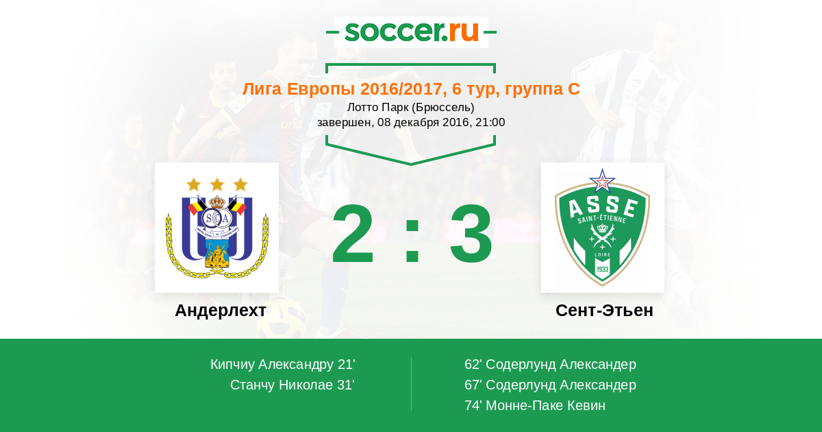 Протокол матча Андерлехт против Сент-Этьен