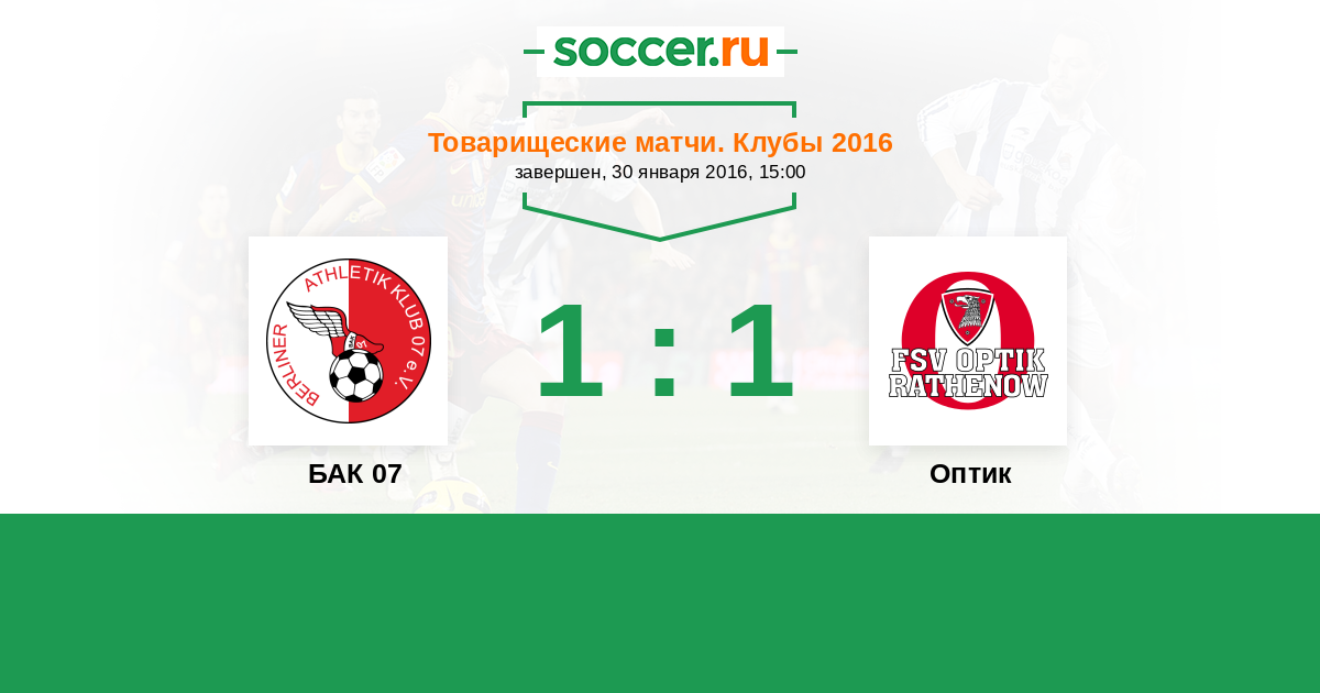 Товарищеские матчи. Клубы 06.01.2018 Оптик Логотип футбольный клуб Оптик (Ратенов) 0:3 Логотип футбольный клуб БАК 07 (Берлин) БАК 07
