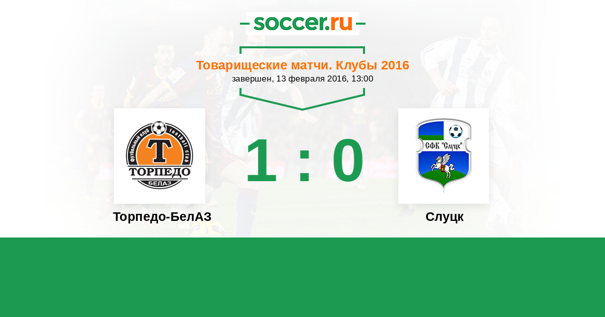 Товарищеские матчи. Клубы 01.02.2021 Торпедо-БелАЗ Логотип футбольный клуб Торпедо-БелАЗ (Жодино) 2:0 Логотип футбольный клуб Слуцк Слуцк