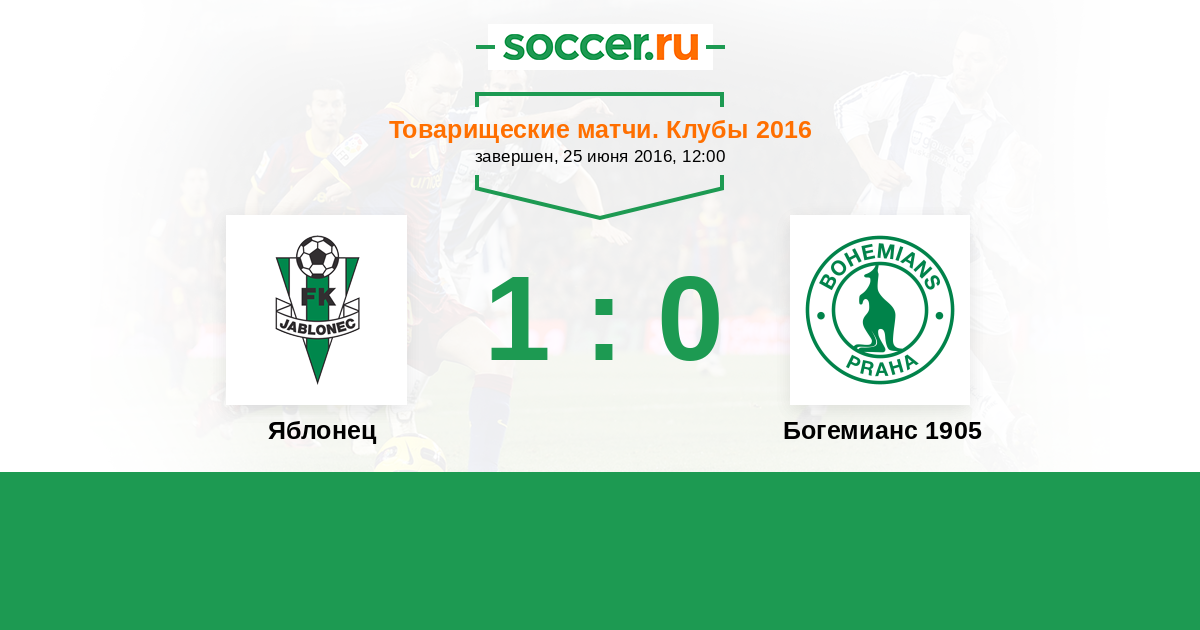 Чехия. Первая Лига 26.08.2016 Богемианс 1905 Логотип футбольный клуб Богемианс 1905 (Прага) 2:0 Логотип футбольный клуб Яблонец (Яблонец-над-Нисоу) Яблонец