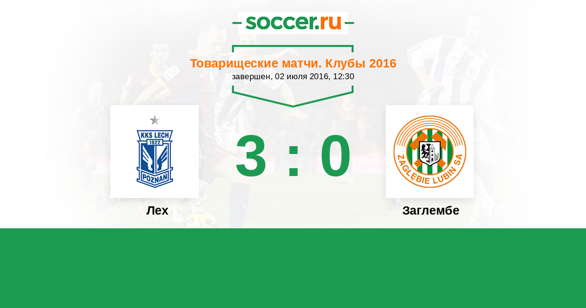 Польша. Экстракласса 24.07.2016 Лех Логотип футбольный клуб Лех (Познань) 0:2 Логотип футбольный клуб Заглембе (Любина) Заглембе