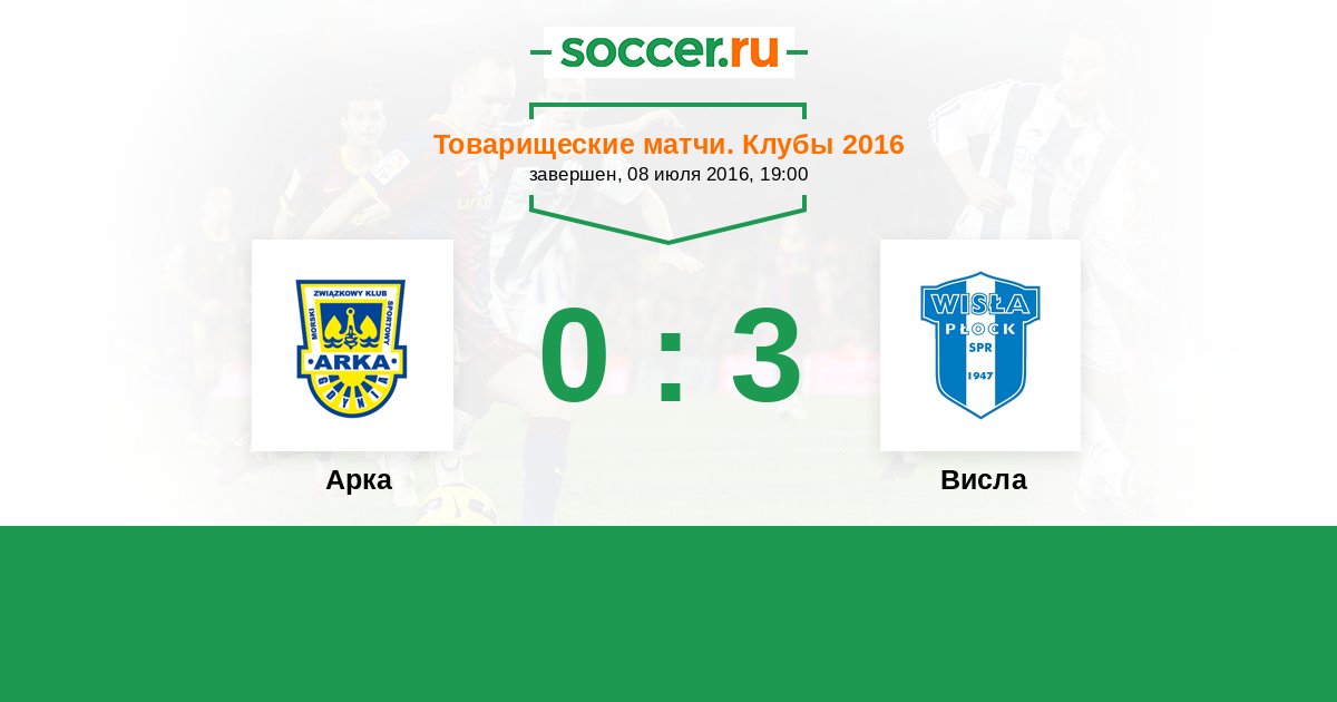 Товарищеские матчи. Клубы 07.09.2018 Арка Логотип футбольный клуб Арка (Гдыня) 0:0 Логотип футбольный клуб Висла (Плоцк) Висла