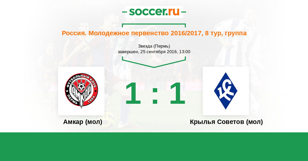 Россия. Премьер-Лига U21 07.04.2017 Крылья Советов (мол) Логотип футбольный клуб Крылья Советов (мол) (Самара) 1:1 Логотип футбольный клуб Амкар (мол) (Пермь) Амкар (мол)