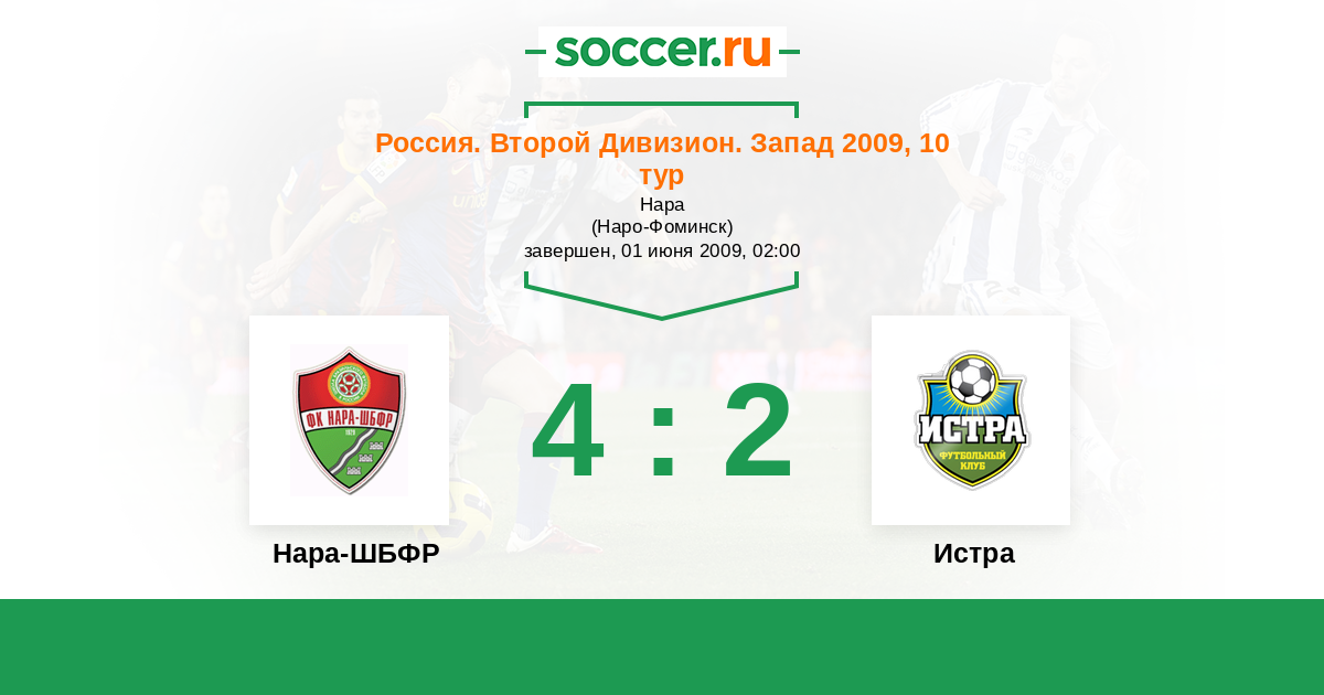 Россия. Вторая лига. Группа 2 10.09.2009 Истра Логотип футбольный клуб Истра 1:1 Логотип футбольный клуб Нара-ШБФР (Наро-Фоминск) Нара-ШБФР