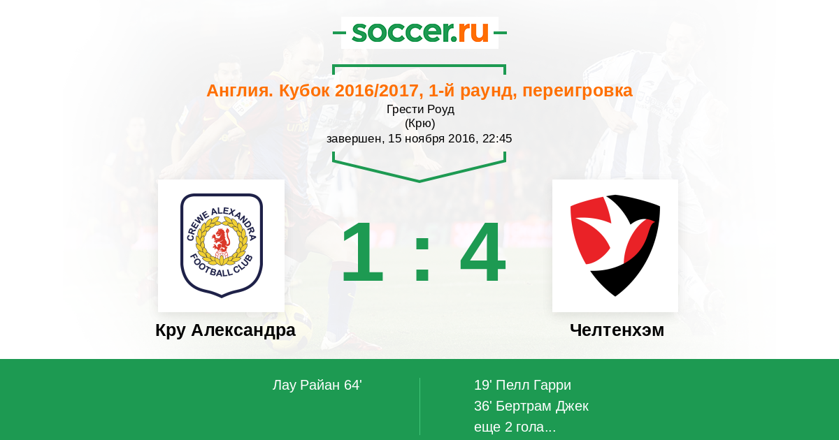 Протокол матча Кру Александра против Челтенхэм