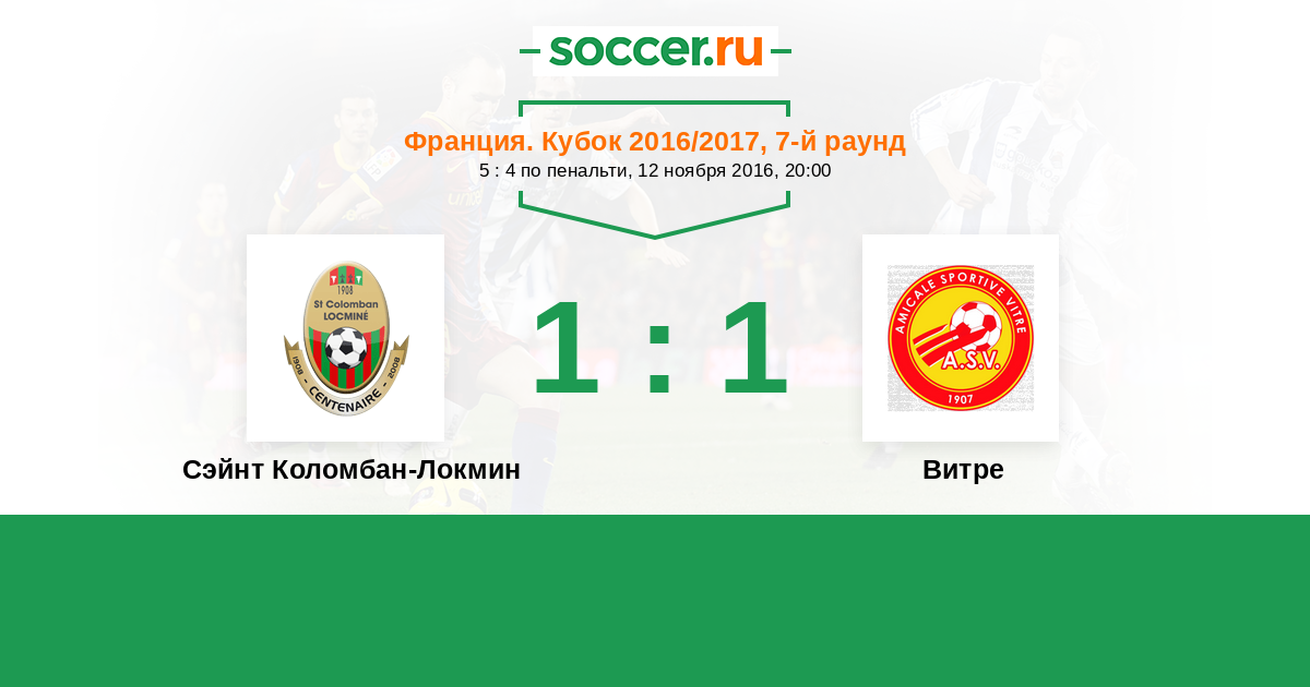 Франция. Кубок 11.11.2017 Витре Логотип футбольный клуб Витре 5:1 Логотип футбольный клуб Сэйнт Коломбан-Локмин Сэйнт Коломбан-Локмин