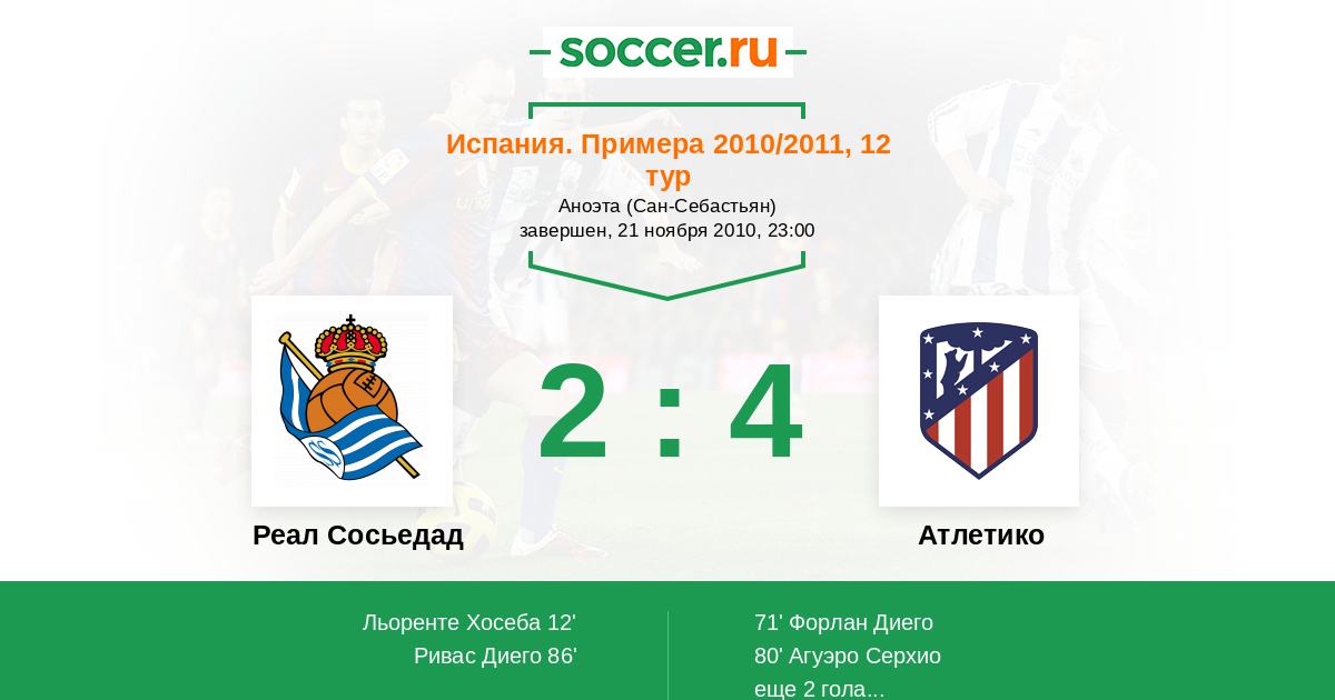 71' (1:1) Форлан Диего (7) (Агуэро Серхио (10))