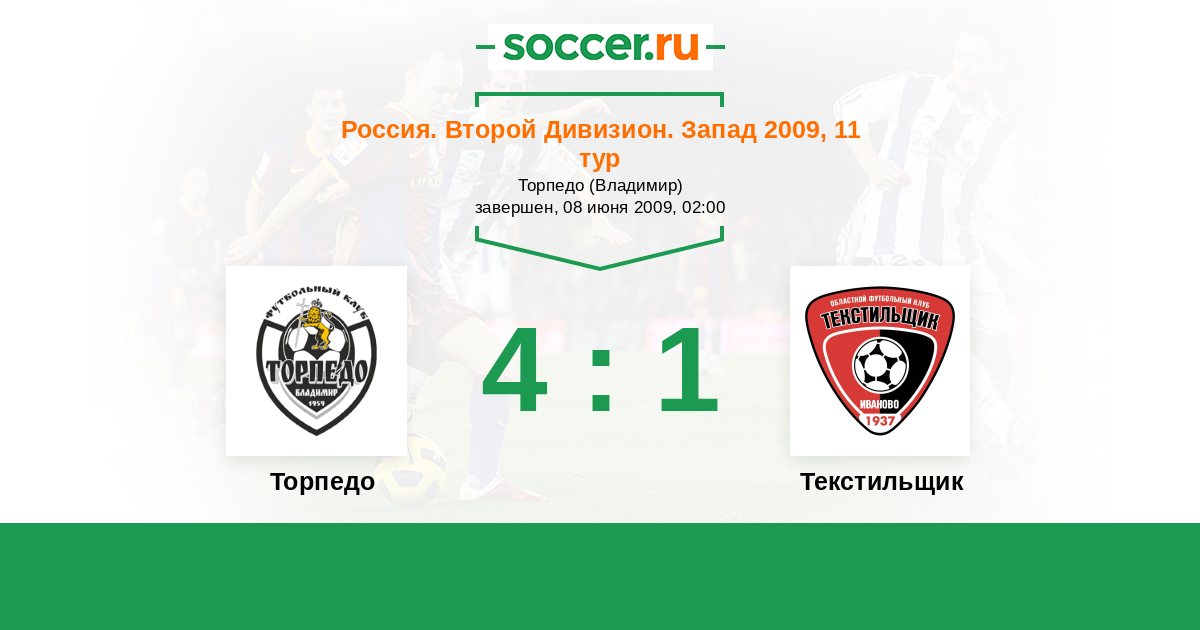 Россия. Вторая лига. Группа 2 20.09.2009 Текстильщик Логотип футбольный клуб Текстильщик (Иваново) 1:0 Логотип футбольный клуб Торпедо (Владимир) Торпедо