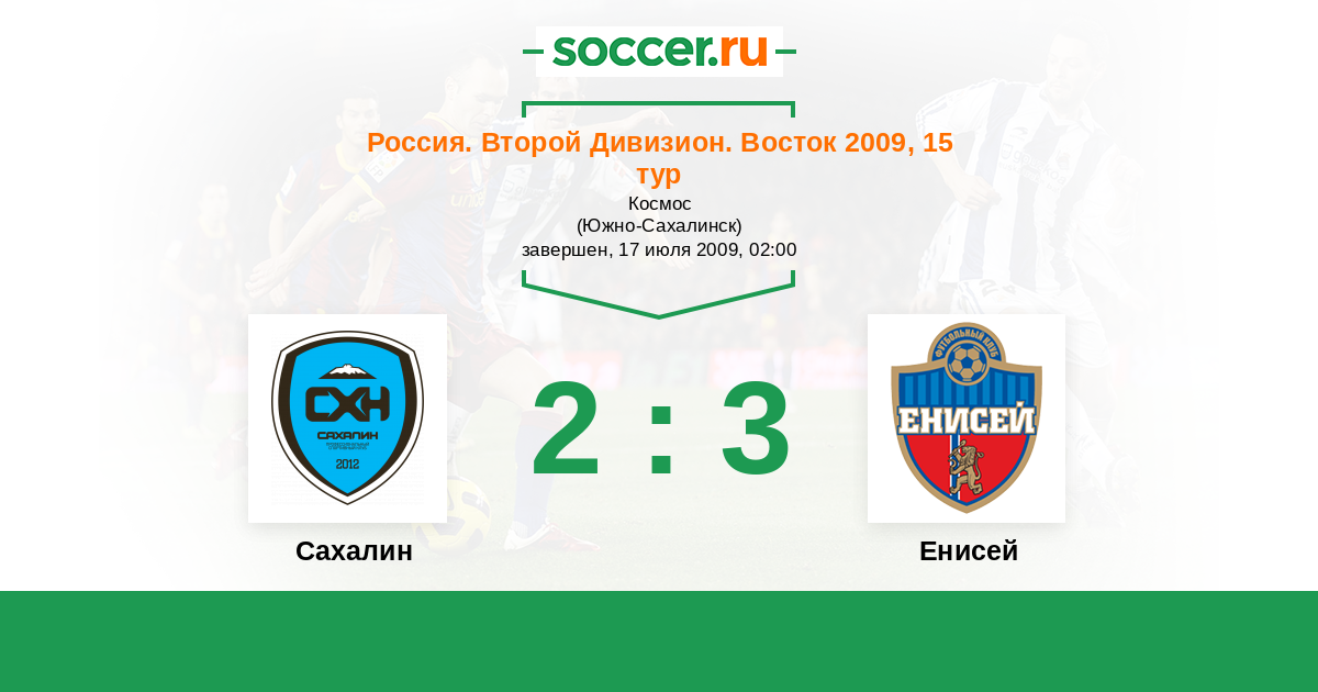 Россия. 2-й дивизион. Восток 30.05.2009 Енисей Логотип футбольный клуб Енисей (Красноярск) 0:0 Логотип футбольный клуб Сахалин (Южно-Сахалинск) Сахалин