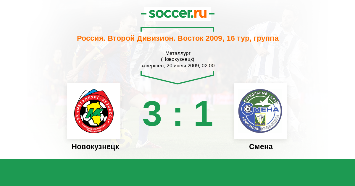 Россия. 2-й дивизион. Восток 02.06.2009 Смена Логотип футбольный клуб Смена (Комсомольск-на-Амуре) 0:1 Логотип футбольный клуб Металлург-Кузбасс (Новокузнецк) Металлург-Кузбасс