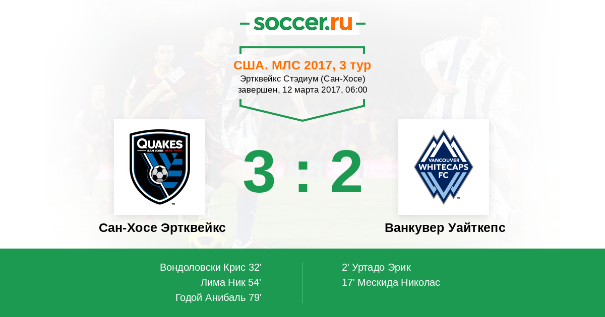 Протокол матча Сан-Хосе Эртквейкс против Ванкувер Уайткепс