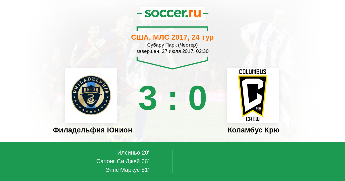 Протокол матча Филадельфия Юнион против Коламбус Крю