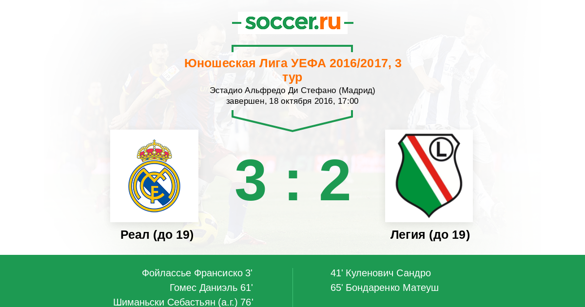 Протокол матча Реал (до 19) против Легия (до 19)